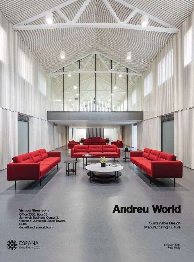 La empresa española Andreu World equipará con su mobiliario el pabellón de España en Expo 2020 Dubai, con lo que se ha erigido en uno los principales patrocinadores de la presencia española en la exposición internacional. Para ello, Andreu World ha diseñado una propuesta que encaja a la perfección con el espíritu del evento ya que incluye mobiliario de diseño sostenible para todas las zonas del recinto.