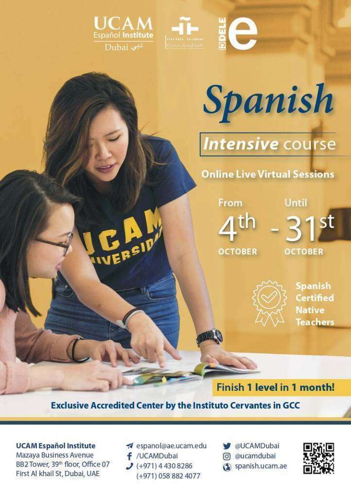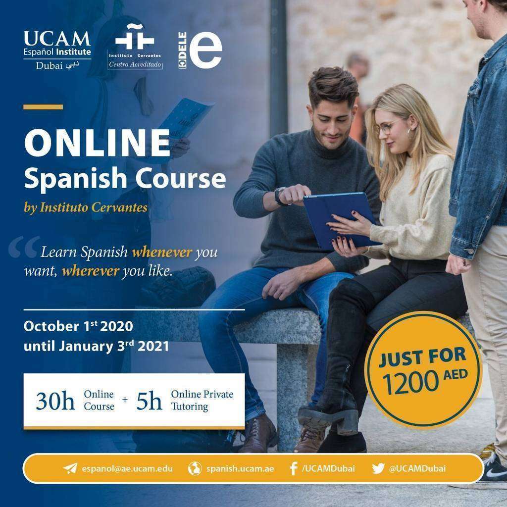 Las inscripciones en UCAM Dubai (ver localización) están abiertas ahora para los dos cursos online que comienzan el 1 de octubre: uno través de la plataforma del Instituto Cervantes (sin horarios) y otro intensivo y en directo, es decir, los alumnos se conectan en un horario determinado y reciben la clase con el profesor por medio de una plataforma de videoconferencia que permite interactuar en todo momento.