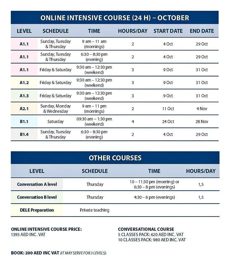 Si se prefiere asistir a clases grupales con un profesor está disponible un curso intensivo de español desde el 4 de octubre hasta el 31 de octubre con 24 horas dividido en seis horas por semana.