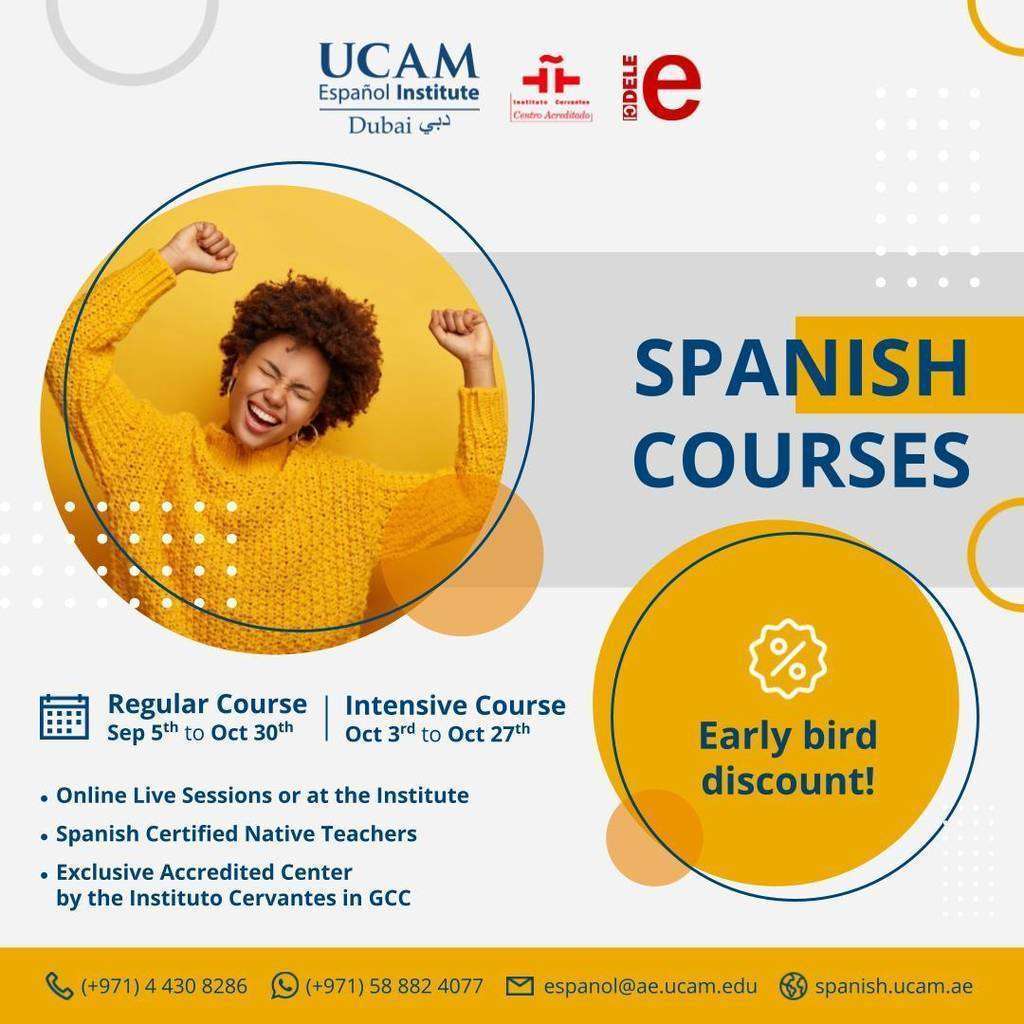 El inicio de la nueva temporada de estudios se encuentra a la vuelva de la esquina. Y UCAM Español Institute ya lo tiene todo listo para que impartir los próximos cursos de español para adultos, que empezarán la semana del 5 de septiembre y se prolongarán hasta el 30 de octubre. Seguro que en numerosas ocasiones tus amigos en Emiratos Árabes Unidos te han comentado que les encantaría aprender español. Pues ahora es el momento perfecto para que les aconsejes que de la mano de UCAM Dubai tienen la mejor opción.