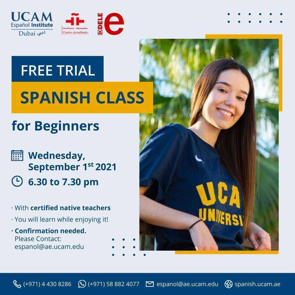 Y para que conozcan de forma directa cómo son los cursos de español para adultos de UCAM Dubai, lo más adecuado es que asistan a la clase de prueba gratuita para principiantes que el centro llevará a cabo de forma online el próximo 1 de septiembre de 18.30 a 19.30 horas. Es una gran oportunidad para saber en detalle qué ofrecen los cursos antes de inscribirse. Para asistir sólo hay que completar este formulario.