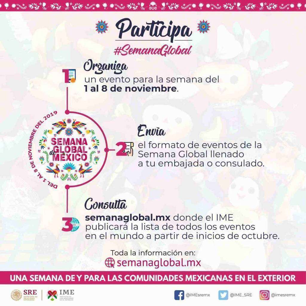 El Instituto de los Mexicanos en el Exterior (IME), por medio de las representaciones de México en el mundo, ha convocado a las comunidades mexicanas que residen en el extranjero a participar en la primera edición de la Semana Global de México, que se realizará del 1 al 8 de noviembre del 2019.