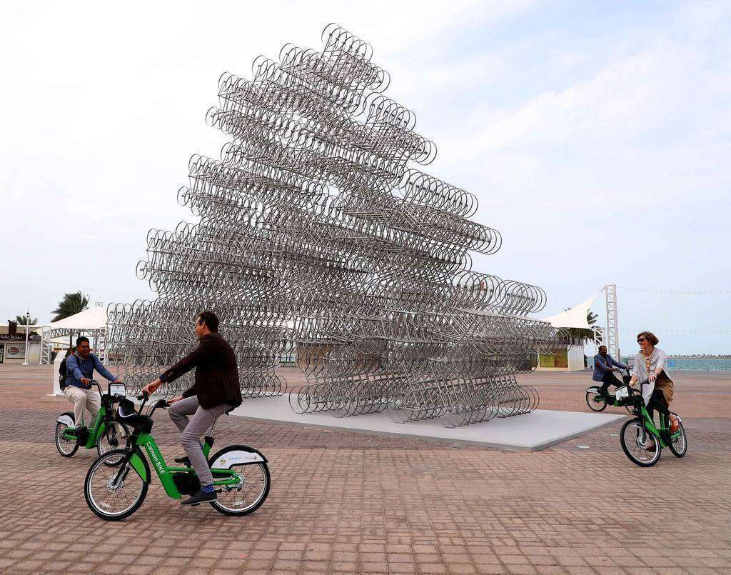 Los transeúntes en Abu Dhabi se encontraron en los últimos días con una impresionante escultura conformada por cientos de bicicletas apiladas que crean una asombrosa ilusión óptica en la Corniche en la capital de EAU.
