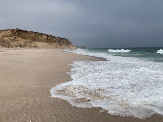 Una amiga española que ya no vive en Emiratos me habló varias veces de la posibilidad de avistar tortugas marinas en Omán. En realidad, nunca me enteré muy bien cómo era el asunto. Pensé, que al igual que el avistamiento de delfines en Musandam, un trozo de tierra rodeado de fiordos en la punta norte de Omán, en el estrecho de Ormuz, te montabas en un barco y las veías en el agua. Pero no, para poder ver a las tortugas tienes que reservar excursión en la Reserva de Tortugas de Ras Al Jinz, al sur de Muscate, y al sur de la ciudad Sur de Omán. En ese microclima rodeado de acantilados de arena, montañas de color negro, rojo y cobre, playas blancas y olas de tres y cuatro metros que azotan las rocas y el mar de manera salvaje y explosiva, las tortugas de más de un metro de largas y con más de 200 kilos van a aovar a la costa. Hasta 300 tortugas visitan las playas cada noche en los meses de junio, julio y agosto para formar sus nidos y dejar allí alrededor de 100 huevos de los que nacerán – o no- tortuguitas dos meses después. Todo este ciclo natural se da en la época de los monzones, de ahí el aspecto aterrador del océano Índico. Yo soy de costa, nací en una ciudad del océano Atlántico, frío y agitado, y menos un periodo de dos años, siempre he vivido al lado del mar. En Emiratos Árabes Unidos también veo el mar desde mi balcón, aunque aquí lo raro es que el mar esté agitado, siempre está balsa, sosegado y en calma. Lo que vi y sentí en este rincón de Omán, en Ras Al Jinz, era totalmente desconocido para mí, ni en los acantilados de Sagres, la esquina sur-oeste de Portugal, me había sentido tan insignificante ante el mundo. Cuando me bajé del coche y vi las olas, el agua, y los acantilados, tuve miedo, miedo a la enormidad de ese paisaje y a que solo la espuma que llegaba a la orilla de ese agua tenía tanta fuerza que podía arrastrarme hasta otro mundo. El miedo estaba mezclado con zozobra y también con excitación por lo nuevo. Paseé por esta playa de un pico al otro, observando la fauna del lugar, no sólo huevos, tortugas, también había cangrejos, y enormes, lo que en mi ciudad llamamos centollos, y algunos se escondían en sus madrigueras, pero otros permanecían intactos a mi lado, no sentían miedo, estaban en su territorio.