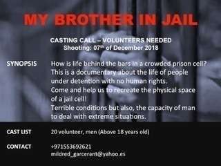 El documental 'My brother in jail', que está siendo filmado por la venezolana Mildred Garcerant en Abu Dhabi, se encuentra en la búsqueda de 20 voluntarios varones que ayuden a representar este corto de 10 minutos que cuenta la historia real del hermano de la directora, quien pasó 25 días en un centro de detenciones en condición de hacinamiento.