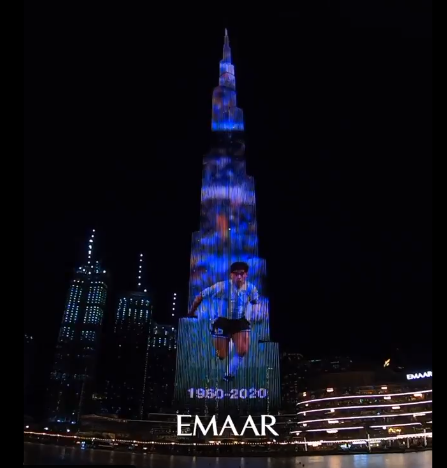 "Burj Khalifa rinde homenaje al legendario Diego Maradona", decía un tuit en la cuenta de Twitter de Burj Khalifa. "Que su alma descanse en paz."