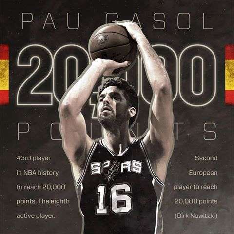 El español Pau Gasol, pivot de los San Antonio Spurs, ha hecho historia en la NBA, anotando su punto 20.000 y coronándose como el triplista más efectivo de la historia en una temporada, con un porcentaje de acierto desde la línea de tres puntos de 53,8% (56-104).
