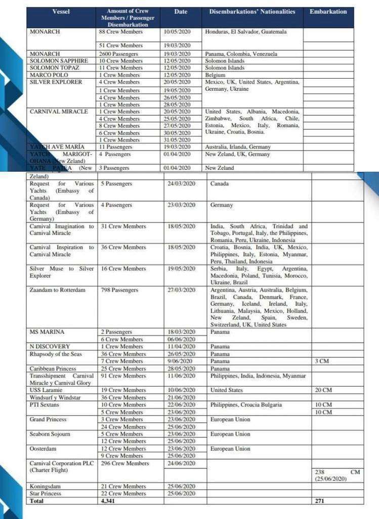 Panamá trabaja ardua e incansablemente en pro de sus 318.000 marinos a bordo de los más de 8.000 buques que pertenecen a su pabellón, a través de la ejecución de acciones que han sido plenamente comprobadas nacional e internacionalmente, las cuales fueron reforzadas durante este tiempo de crisis sanitaria, como la Declaración de la República de Panamá en apoyo al Marco Recomendado de Protocolos emitido por la OMI sobre cambios seguros de la tripulación debido al COVID-19 a través de Circular No.4204/add14 (7 de mayo de 2020), la Declaración en respaldo a la decisión de la Organización Marítima Internacional (OMI) de designar a la gente de mar como trabajadores claves 'Key Workers', a partir del 17 de mayo de 2020 y la adopción de la Merchant Marine Notice No. 003-2020, por medio de la cual se adoptan medidas relativas a la gente de mar para ser aplicadas durante la pandemia del COVID-19.