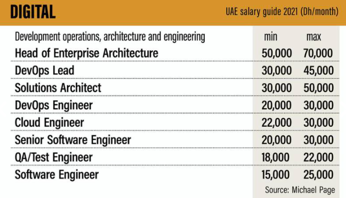 A continuación la guía salarial por profesión con el sueldo máximo y mínimo expresado en dirhams, la moneda de Emiratos tiene una paridad fija con el dólar estadounidense. Un dólar equivale a 3,67 dirhmas.