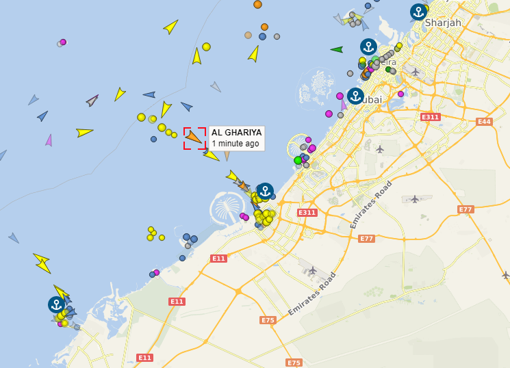 El petrolero, Al Ghariya, cargó un cargamento desde Ras Laffan el 10 de mayo y está fondeado, pero muestra que debe descargar el cargamento en Jebel Ali en Dubai el 13 de mayo.