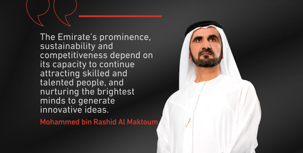 "La prominencia, sostenibilidad y competitividad de Emiratos depende de la capacidad para cultivar gente experta y talentosa, atrayendo las mentes más brillantes para generar ideas innovadoras": jeque Mohammed Al Maktoum. publicado en su perfil oficial de Linkedin).