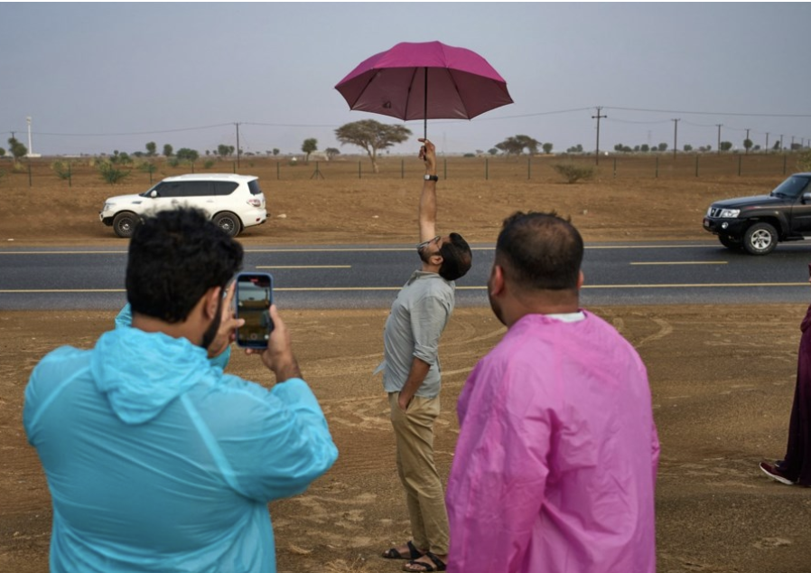 Decenas de personas se reúnen en Emiratos Árabes para ver la lluvia