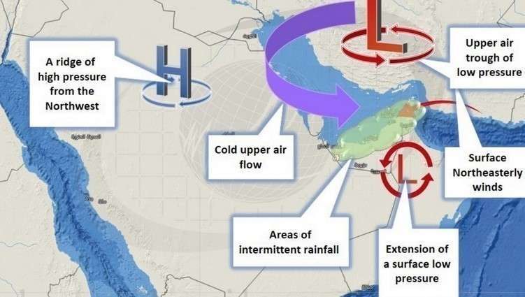 "El país se ve afectado por una baja presión y una masa húmeda de aire cálido desde el sur. Esta condición climática conducirá a la formación de nubes de lluvia sobre áreas dispersas, asociadas con tormentas y vientos racheados", explicó un portavoz del NCM, según informa el diario Khaleej Times.