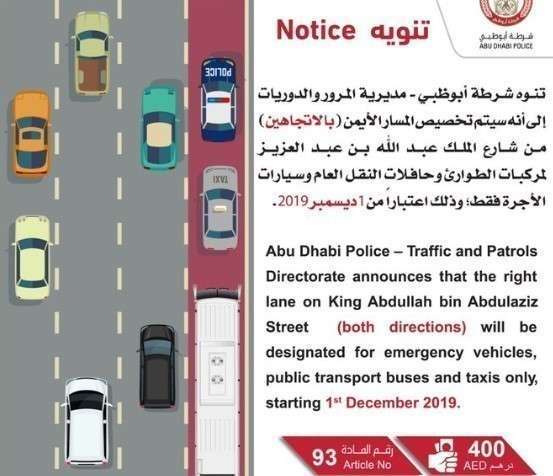 Según anunció la Dirección de Patrullas y Tráfico de la Policía de Abu Dhabi en su cuenta de Twitter, el carril será designado exclusivamente para vehículos de emergencia, autobuses de transporte público y taxis,