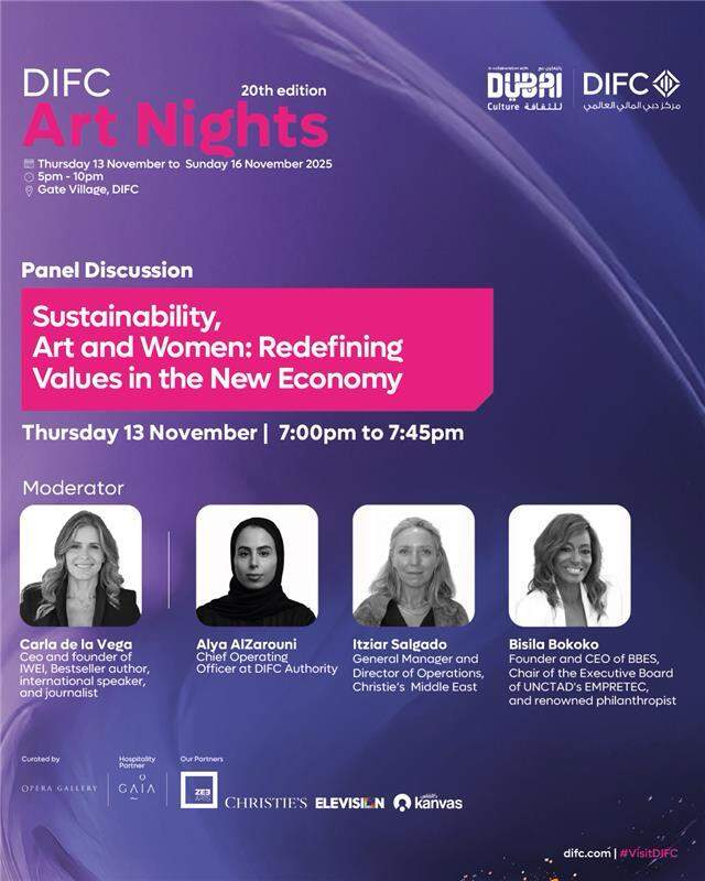 "Este viaje me trae por dos motivos muy especiales", declaró Bokoko. "Participar como panelista en DIFC Art Nights, dentro del panel 'Sustainability, Art and Women: Redefining Values in the New Economy', donde hemos explorado cómo el arte, la sostenibilidad y el liderazgo femenino están redefiniendo los nuevos parámetros de valor económico en la región". La empresaria destacó la compañía de sus amigas y colegas Carla De la Vega e Itziar Salgado durante el evento.