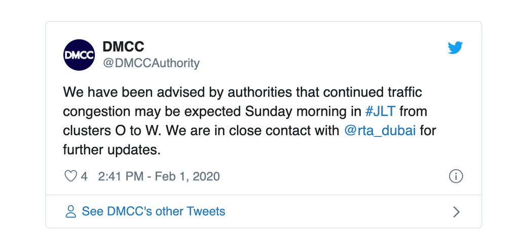 "Las autoridades nos han informado que se puede esperar una congestión continua del tráfico el domingo por la mañana en #JLT desde los grupos O a W. Estamos en contacto cercano con @rta_dubai para obtener más actualizaciones", escribieron en Twitter.