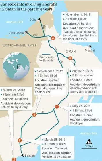 Este siniestro es el último de una serie de colisiones en la carretera hacia Salalah que se ha cobrado vidas de muchas personas de Emiratos en los últimos años.