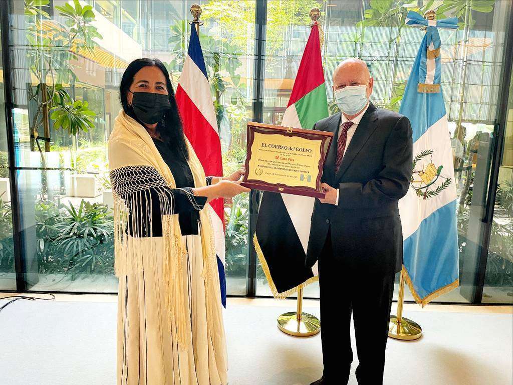 EL CORREO DEL GOLFO, en su afán de apoyar a los países hispanos en Emiratos Árabes y de subrayar la labor que llevan a cabo en estas tierras, a veces muy complicada, entregó tanto al embajador de Guatemala como al de Costa Rica una placa con motivo del acto por el Bicentenario de la Independencia de Centroamérica llevado a cabo en Sharjah.
