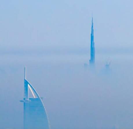 Impactante imagen del horizonte de Dubai con densa niebla compartida por el jeque Hamdan