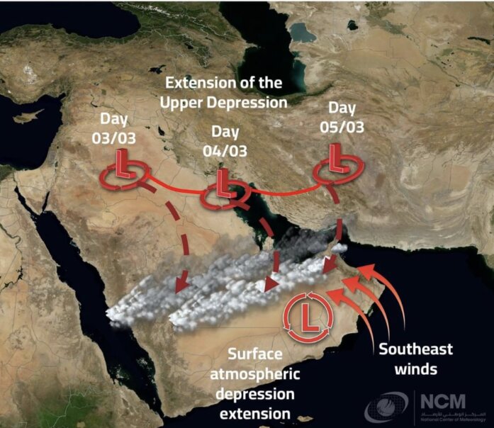El Centro Nacional de Meteorología de Emiratos Árabes Unidos (NCM) ha emitido este viernes un pronóstico de tiempo inestable del 4 al 5 de marzo, debido a un sistema de baja presión acompañado de una masa de aire frío. Se anticipan lluvias de ligeras a moderadas, con posibilidad de episodios más intensos en algunas regiones del norte y este. Vientos moderados a fuertes del sureste cambiarán al noroeste, generando polvo en el ambiente y un descenso de las temperaturas.