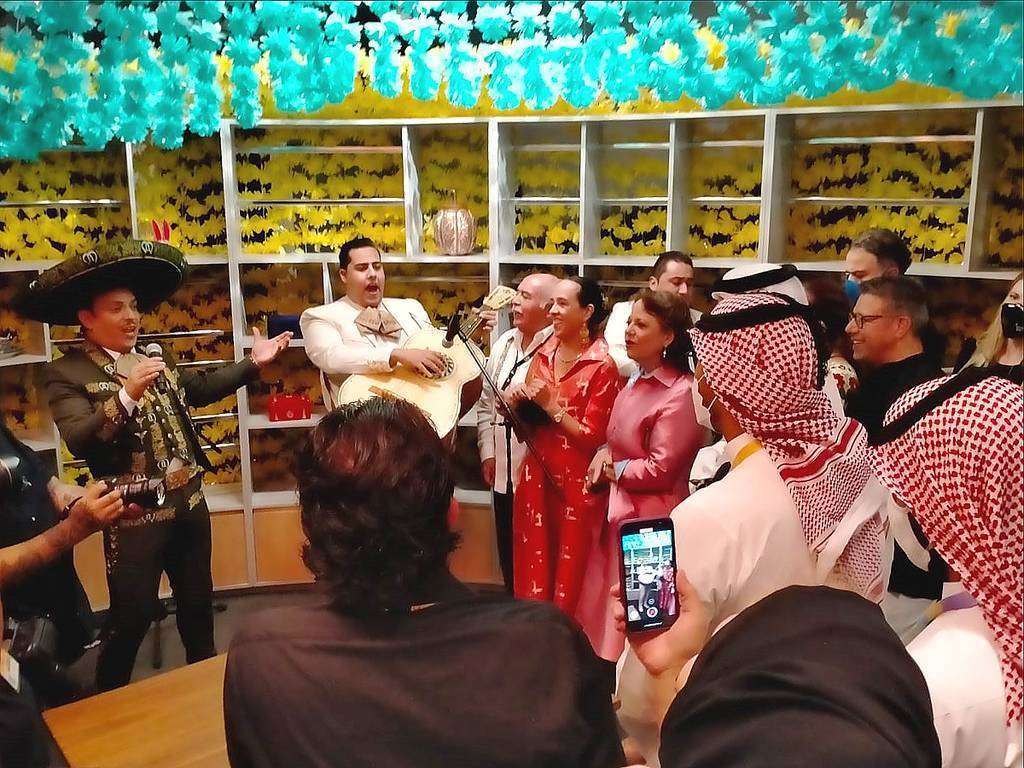 No faltó nadie a este gran evento. Y, por supuesto, estuvo presente para derramar su arte un excelente grupo de mariachis. Todos cantaron. Fue tal la expectación generada que decenas de personas, debido a los protocolos establecidos para evitar la propagación del coronavirus, tuvieron que permanecer a la puerta del Pabellón, cuya fachada lució con especial esplendor en esta noche. Dentro también hubo numerosos miembros del cuerpo diplomático acreditado ante Emiratos Árabes y destacados invitados de los sectores empresarial y cultural local e internacional.