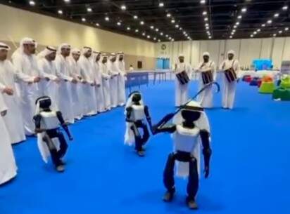 Robots con tocados emiratíes bailan la danza tradicional Ayyalah en Abu Dhabi