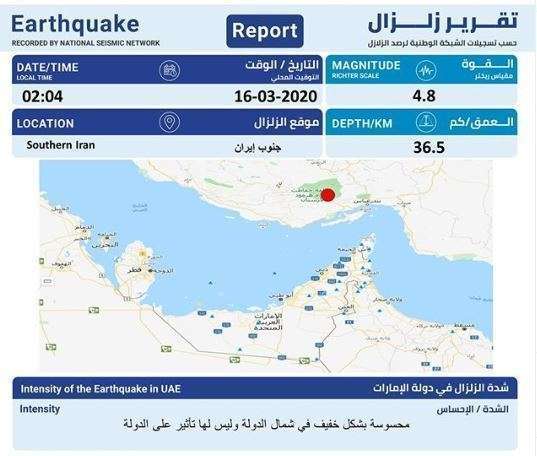 Un seísmo de magnitud 4,8 sacudió el sur de Irán cerca de la costa del Mar Arábigo a las 2:04 am (hora de EAU) el 16 de marzo, leves temblores se hicieron notar en zonas de EAU, según el Departamento Nacional de Meteorología (NCM).