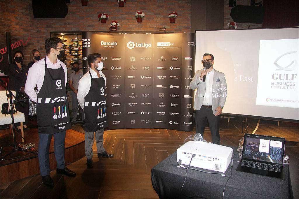 Fue precisamente Amaya Delgado quien, tras dar la bienvenida, dio paso a los intervinientes tanto de Barceló como de LaLiga, quienes pusieron énfasis en los logros de la alianza entre ambas organizaciones en favor de la segunda edición del Festival Gastronómico Spanish Extravaganza que actualmente se lleva a cabo en Dubai. Tras sus palabras, Daniel Barriga procedió a la entrega de unos vistosos delantales que conmemoran la celebración del festival.