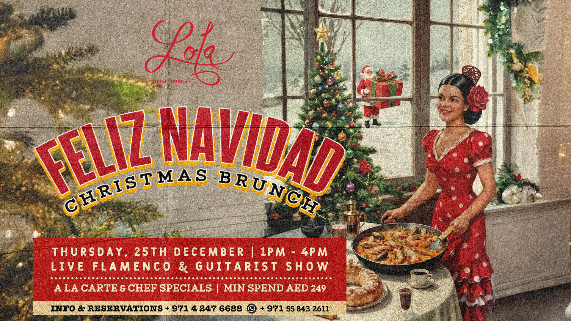 El día de Navidad, el jueves 25 de diciembre, Lola Taberna ofrecerá un brunch especial de 1 PM a 4 PM. Los visitantes podrán deleitarse con la música de guitarristas y bailaores flamencos, mientras disfrutan de auténticos sabores españoles. El gasto mínimo en el brunch es de AED 249.