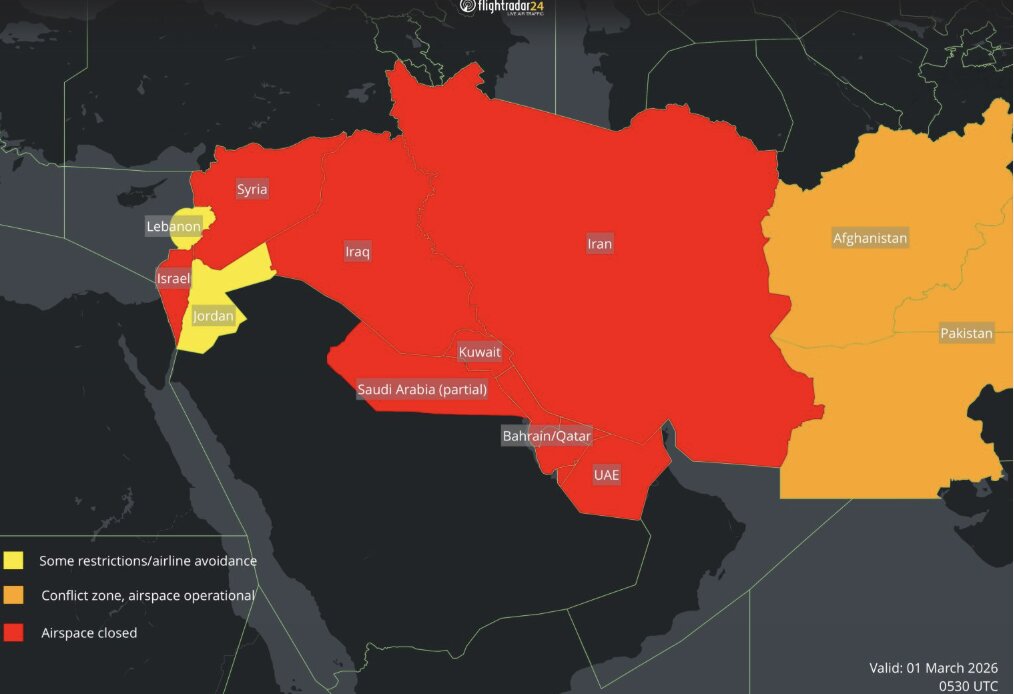 El espacio aéreo de Oriente Medio sigue enfrentando restricciones significativas, según los últimos datos proporcionados por Flightradar24. La mayoría de las Notificaciones a las Misiones Aéreas (NOTAM) que actualmente limitan el tráfico aéreo en la región están programadas para expirar a última hora de la mañana del 1 de marzo, aunque no se descarta su posible extensión.