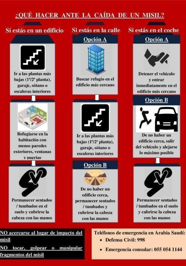 La Embajada de España en Arabia Saudita ha emitido un cartel informativo sobre la forma de actuar ante la caída de un misil.