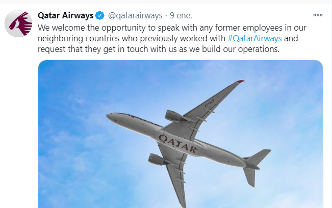 En una publicación este sábado la aerolínea estatal de Qatar pide en su cuenta de Twitter que los ex empleados de la compañía en los países vecinos se pongan en contacto con ellos a medida que desarrollan sus operaciones. Miles de trabajadores del sector de la aviación han perdido su empleo en los últimos meses.