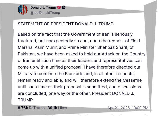 En un mensaje en su red social Truth Social, Trump explicó que el Gobierno iraní está "gravemente dividido" y que la solicitud pakistaní busca suspender el conflicto hasta que ambos bandos puedan concluir las negociaciones. Sin embargo, mantuvo el bloqueo naval impuesto a los buques iraníes en respuesta al fracaso de la primera ronda de diálogo celebrada en Islamabad el 11 y 12 de abril.