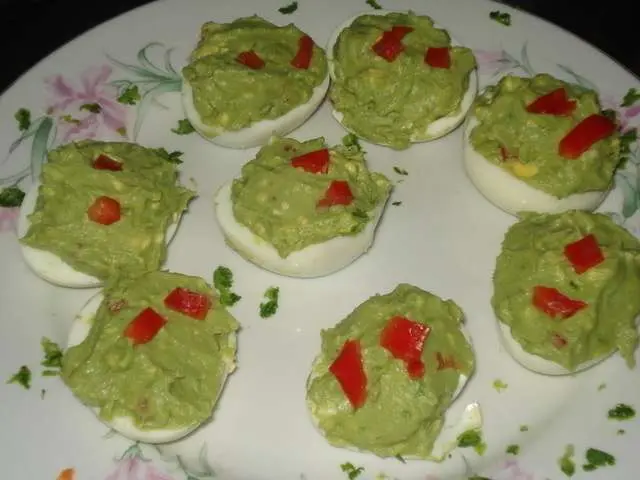 Sencillísima. Se abre un aguacate a la mitad y a lo largo, se le quita primero el hueso clavando un cuchillo en su mitad y haciendo un leve giro de muñeca. A continuación se le desprende la piel ayudándonos de una cucharilla y se le hace un leve corte en la base de cada mitad para que se sostengan bien en el plato. Le ponemos por encima un par de cucharadas soperas de salsa sencilla de tomate, que habremos elaborado poniendo una lámina de aceite a calentar y cuando esté calentita se le añade tomate triturado, sal, pimienta y un par de hojas de albahaca cortadas finitas. Se retira como es natural cuando el tomate espesa, que es señal de que ya está frito y la salsa terminada. Por encima de estas cucharadas de salsa ponemos un par de huevos de codorniz que hemos escalfado en agua hirviendo con su sal y un chorrito de vinagre.