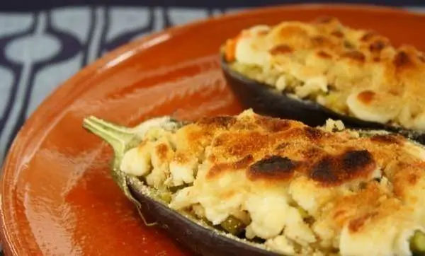 Se tomarán tantas berenjenas como comensales, pero que sean relativamente pequeñas. Se les corta la parte superior para proceder a vaciarlas y de la parte inferior se le corta también una lámina para que se puedan quedar de pie. Una vez vaciadas, no totalmente como es natural, se introduce dentro una mezcla de tomate pelado y cortado fino, perejil, sal, aceite, zumo de limón y arroz.