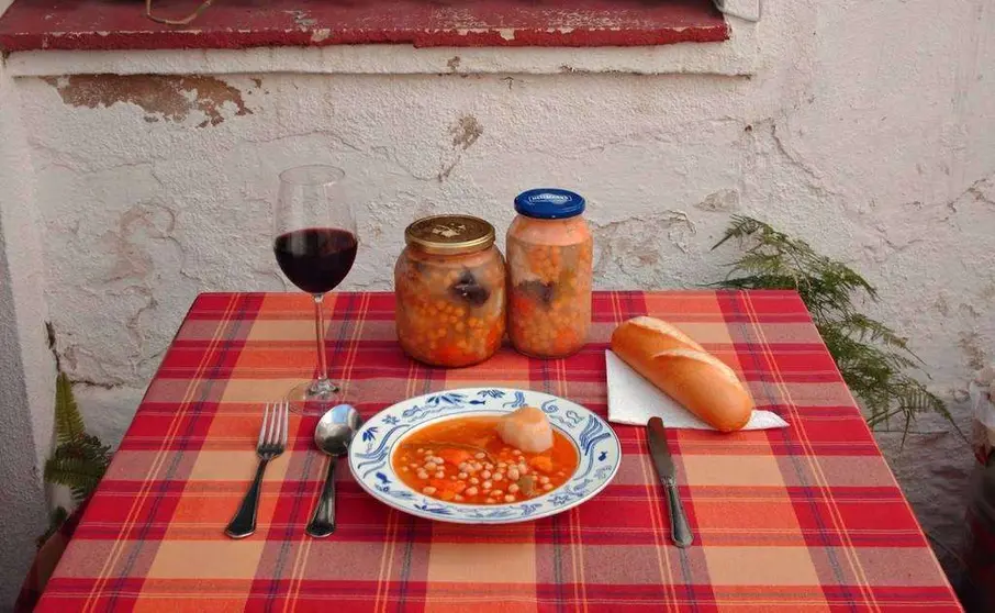 En la olla, y todo en frío, se depositan primero los huesos, y encima tocinos, chacinas y carnes. Luego las verduras: tres zanahorias, un nabo, una patata, un trozo de calabaza, un puñado de judías verdes, una ramita de apio sin las hojas y lo blanco de un puerro. Y por último, garbanzos puestos en remojo la víspera. Se cubre todo de agua y a cocer en la olla a presión, pero a fuego mínimo. Una hora y se acabó. Luego comprobamos como están los garbanzos, y si hiciera falta, pues ya con la olla destapada lo tenemos a fuego vivo hasta que los garbanzos estén tiernos. Se sirven tres platos. El primero, con algo de verdura, el caldo con fideos; luego los garbanzos con más verduras, y por último la pringá, que cada uno se pondrá lo que le apetezca.