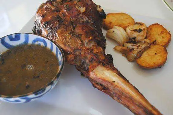 Cordero al horno con salsa de miel. En un bol mezclamos una cebolla bien picada y tres o cuatro dientes de ajo, también picados. Añadimos medio vaso de vino oloroso seco y un chorreón generoso de aceite. Por último le pondremos pimienta negra recién molida, pimienta de cayena también molida, romero, azafrán y cominos que majaremos con un poco de sal, hojas de culantro (cilantro fresco) y de perejil, así como un poco de canela molida, jengibre rallado y orégano. Mezclamos bien todo esto y embadurnamos con la mitad de la mezcla la pata, a la que le habremos puesto antes la sal que creamos conveniente, y la pondremos en una bandeja del horno, el cual estará precalentado a 190º. De vez en cuando no estaría mal dar una vuelta por el horno, abrirlo y añadir algo de agua para que no se queme la mezcla con la que hemos embadurnado la pata. A la media hora, por ejemplo, podemos sacar la pata del horno y añadirle el resto de la mezcla, y por supuesto agua si hiciera falta. Media hora después sacamos otra vez la pata del horno, pero esta vez para mojarla con agua y otra vez con un chorreón de vino oloroso seco. Recogemos todo lo que podamos de las grasas que ha ido soltando, disueltas con este agua y este vino, y lo colamos antes de ponerlo en un cazo con una cucharada de miel. Echamos algo de agua si fuera necesario y procedemos a reducir la salsa mientras la pata termina de hacerse, lo cual ocurrirá cuando veamos que la carne se desprende ostensiblemente de la caña de la pata. Sólo queda servir, en la misma fuente donde se hizo y con ramas de culantro alrededor. Se corta en lonchas la carne de la pata y se pondrá en una salsera la salsa para que cada cual se sirva sobre la que quiera servir.