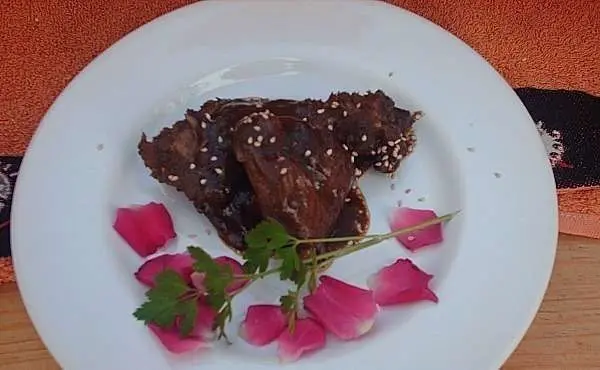 Se deja enfriar no por nada, sino porque no hay necesidad de quemarse las manos. Cuando está a temperatura adecuada, tomamos la pata y la deshuesamos con paciencia y tino. Todo lo que estaba en la bandeja del horno lo pasamos al vaso de la minipimer, añadimos un poquito de vino blanco a lo que se haya quedado adherido, rascamos con una cuchara de madera y todo al vaso. Le metemos caña y procuramos que todo quede homogéneo. A la cazuela con todo ello y a reducir. Cuando está casi reducido y la salsa está empezando a tomar consistencia, añadimos una o dos cucharadas de miel, según cantidad de salsa que hayamos obtenido, y se acabó. Dejamos espesar la salsa, que deberá quedar con un color ámbar oscuro y brillante, además de espesa. Los trozos de cordero se disponen en otra bandeja de horno, ahora más pequeña si queremos, y le ponemos por encima unos botoncitos de mantequilla, para hornear y que se queden crocantes por el exterior y en su punto en el interior. Se sirve más o menos como se ve en la imagen, napados con la salsa y adornados con culantro o perejil y unas hojas de rosa recién cortada. Probadlo y luego me contáis.