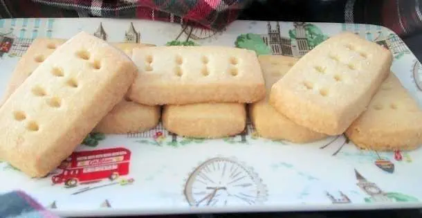Para 24 galletas. 250 gr de harina (2 cups). 75 gr de azúcar (1/2 cup). 225 de mantequilla (1/2 pound) a temperatura ambiente. Un pellizquito de sal si utilizáis mantequilla sin sal. Azúcar granulada para espolvorear (opcional). Las originales no la llevan pero yo le puse a la mitad que a cada uno le gustan de una forma.