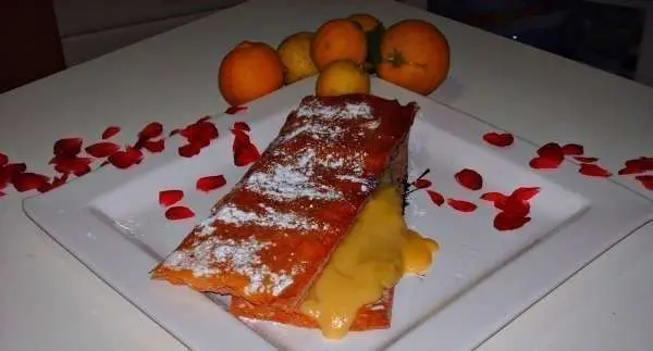 Estaba la mar de buena, pero esperad porque todavía no he terminado, que se me olvidaba deciros que he cogido pasta filo, un par de ellas, las he doblado tres veces y las espolvoreé con azúcar glas, canela y semillas de anís. A continuación hice lo mismo con otras dos hojas de pasta filo y las metí en el horno, a 200º y el tiempo justo en que se ponen morenitas. Después, pues una abajo, la crema encima y a tapar con la otra. Se adorna con más azúcar glas y se acabó. En la foto se aprecian los pétalos de una rosa de mi jardín. Estaba en la mesa y cuando quité el florero para preparar el bodegón, se cayeron unos cuantos pétalos, así que para poca salud, ninguna. Despetalé (anda, me acabo de inventar una palabra) la rosa y los dispuse de modo armónico y un poco maricón por la mesa. Bueno, troncos, y como diría un director general, y troncas, ahí os quedais. Abur.