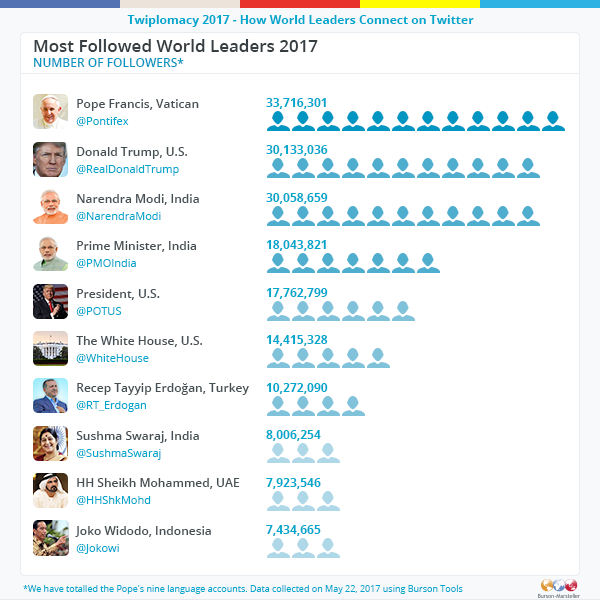 El presidente estadounidense, Donald Trump (@realDonaldTrump), fue el segundo más seguido líder mundial, con 30,1 millones de seguidores en su cuenta personal de Twitter.