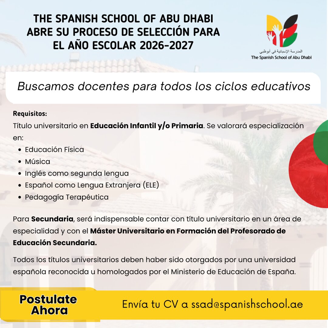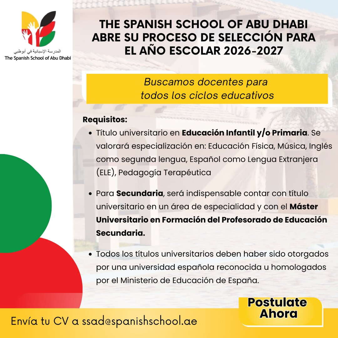 La Spanish School de Abu Dhabi ha abierto su proceso de selección de personal para el año escolar 2026-2027, orientado a docentes que se destaquen por su creatividad y pasión por la enseñanza. La institución busca cubrir posiciones en todos los ciclos educativos, ofreciendo una oportunidad única para profesionales con sólida experiencia en el aula.
