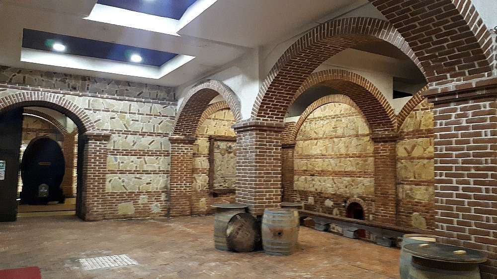 Una vez dentro, y tras haber bajado escaleras decoradas con mosaicos del dios Baco, recorremos -aún de la mano del simpático y profesional vigilante- un pasillo largo de barriles de vino hasta llegar a la puerta de un restaurante en el que nos esperan tres mesas libres para elegir. Las otras dos están ocupadas por turistas rumanos, alemanes y americanos. Hay un cocinero y un camarero, que se lanza a recomendarnos que no pidamos demasiados entrantes puesto que el menú ya incluye mucha comida. Lo cierto es que no son platos abundantes, pero llegan en total a cuatro. De primero ensalada con caviar, de segundo trucha, de tercero bistec de ternera y de cuarto el mejor brownie que he comido en mucho tiempo. Todo un menú de boda acompañado continuamente por una degustación de cinco vinos diferentes, servidos dos veces cada uno. En total, los cuatro platos y las diez copas de vino, más dos botellas de regalo para casa, por el módico precio de 28 euros por persona. El lector sentirá la tentación de cuestionar la calidad del vino, pero el paladar no engaña, aun sin haber estudiado enología.