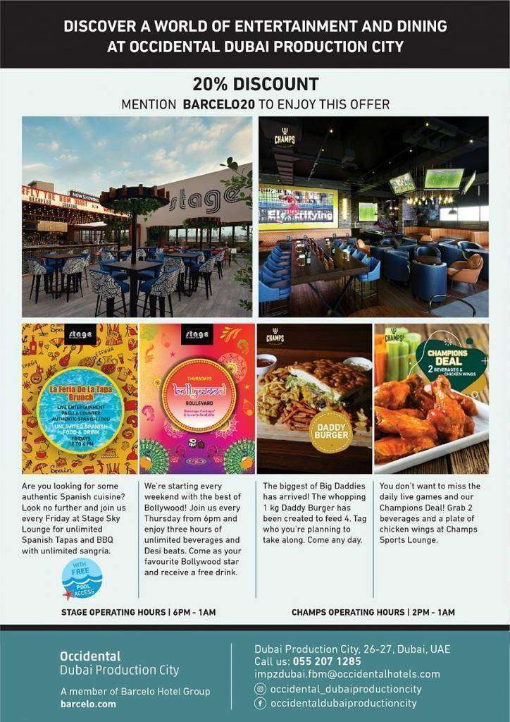 Dubai Production City, 26-27, Dubai, UAE. Teléfono; 055 207 1285. Email: impzdubai.fbm@occidentalhotels.comDubai. Facebook: occidental_dubaiproductioncity. Instagram: occidentaldubaiproductioncity