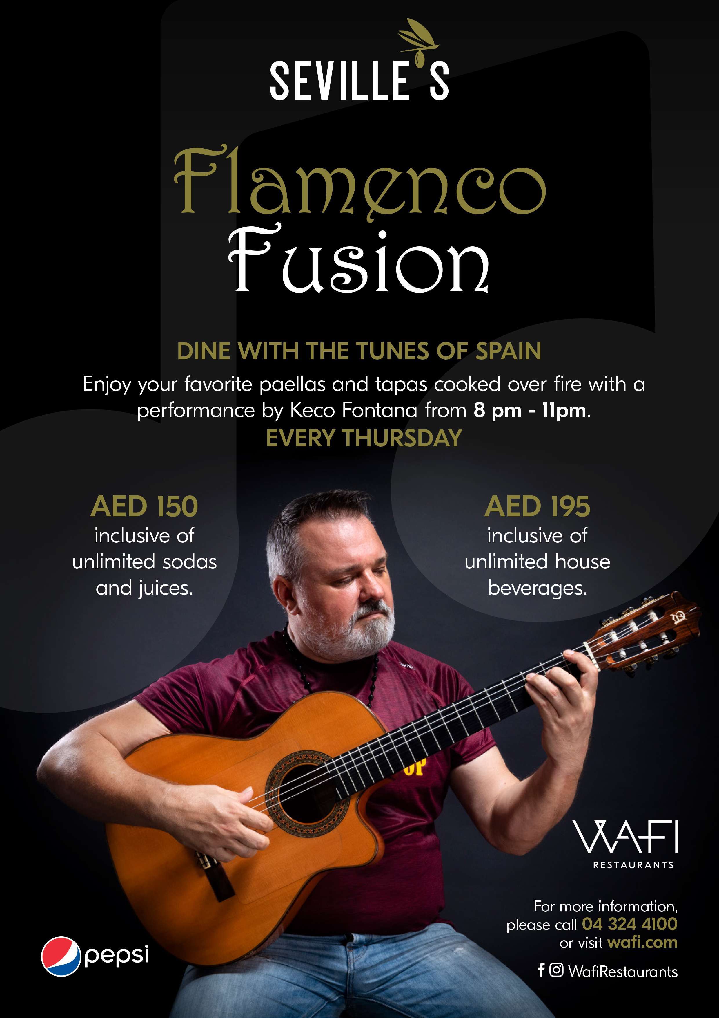 Los fines de semana en el restaurante Seville’s son flamencos. El guitarrista Keco Fontana pone ritmo a las cenas con Flamenco Fusión convirtiendo la velada en un espectáculo redondo con la gastronomía y la música españolas como protagonistas indiscutibles.