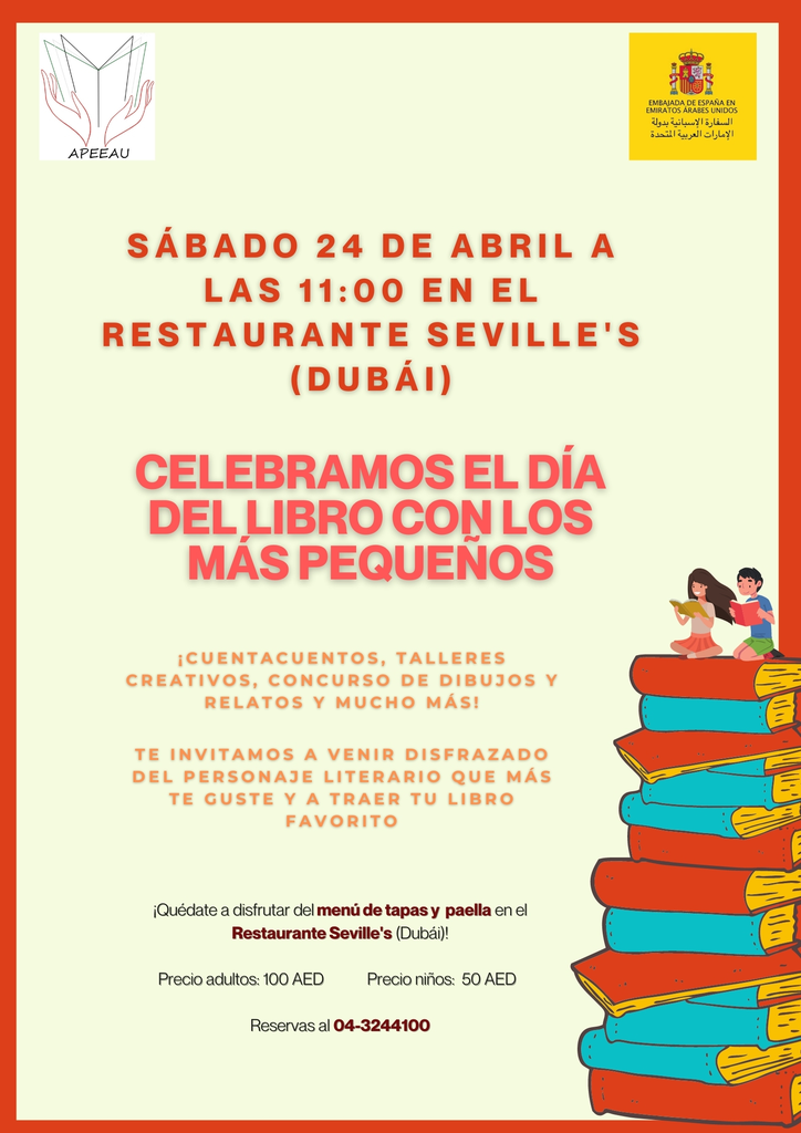 La Embajada de España en Abu Dhabi y la Asociación de Profesores de Español de Emiratos Árabes Unidos (APEEAU) llevarán a cabo una mañana de cuento con las familias hispanohablantes el próximo 24 de abril a partir de las 11.00 horas en el restaurante Seville's de Dubai (ver localización) para conmemorar el Día del Libro.