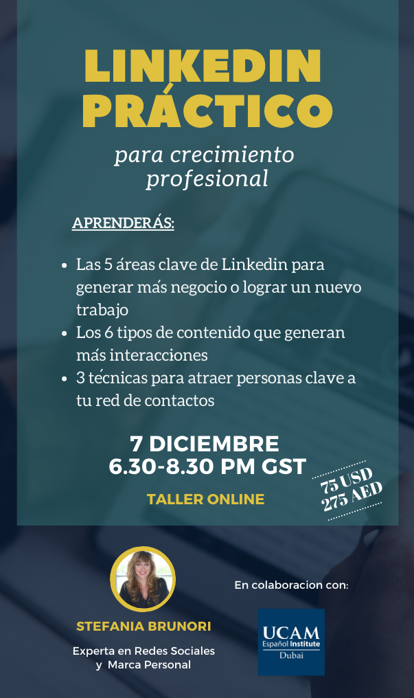 UCAM Español Institute ha programado un taller online sobre el uso de LinkedIn como herramienta de mejora profesional. El curso, que se celebrará el próximo 7 de diciembre, será impartido por Stefania Brunori, española especialista en Marketing Digital y Redes Sociales que cuenta con más de diez años experiencia en Emiratos Árabes Unidos (EAU).