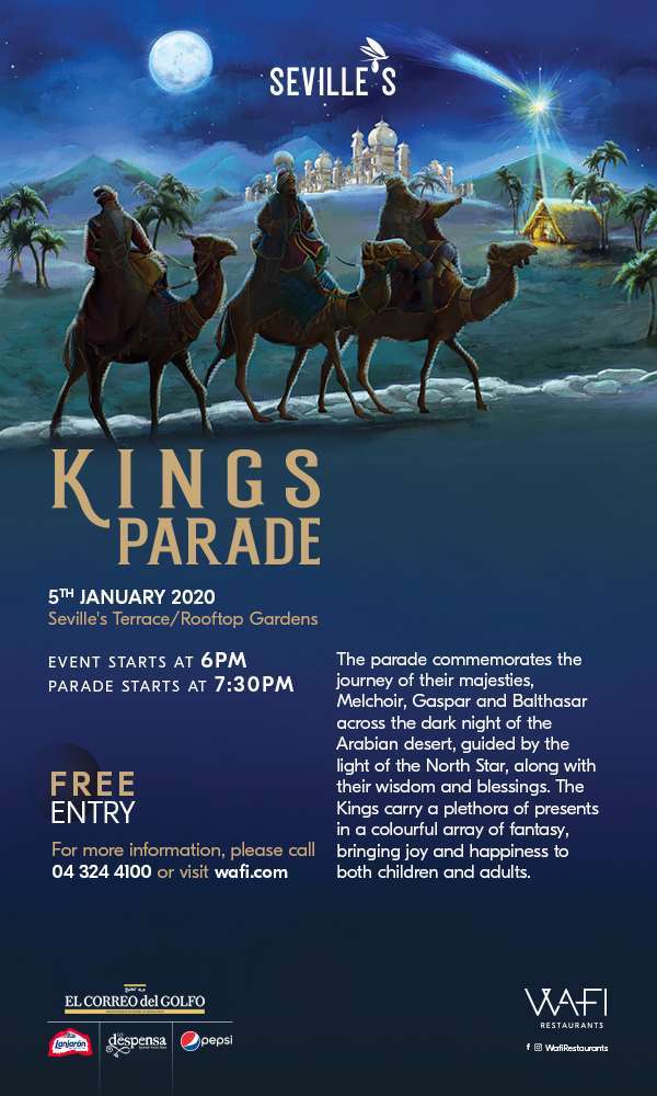 Máxima expectación ante la Cabalgata de Reyes Magos de Dubai en 2020. Con la llegada de la nueva década, los Reyes dubaitíes cumplirán 13 años. Será un gran acontecimiento que, como marca la tradición en la ciudad del Burj Khalifa, se desarrollará el 5 de enero en las terrazas de Wafi (ver localización), junto al restaurante español Seville's, organizador de este gran evento.