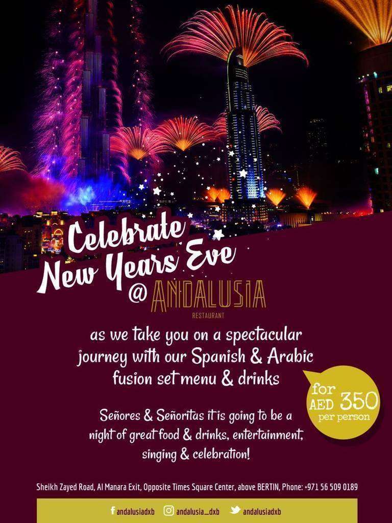 ¿Dónde celebrar la Nochevieja en Dubai? Las propuestas son casi incontables, pero si se quiere poder disfrutar de un menú español fusionado con cocina árabe, el restaurante Andalusia es una de las opciones. Por tan sólo 350 AED por cabeza se garantiza una gran noche de platos exquisitos, bebidas, entretenimiento, canto y celebración. Andalusia está ubicado en Sheikh Zayed Road, en la salida de Al Manara (pinchar para ver localización).