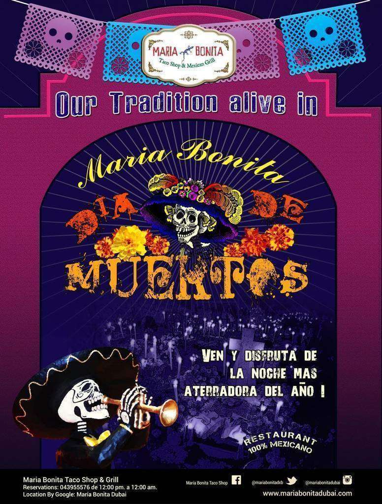 El restaurante mexicano María Bonita Taco Shop & Grill, 100 por cien tradicional, está celebrando una semana festiva en honor al Día de Muertos. Del 23 de octubre al 2 de noviembre todos los que quieran disfrutar de auténticos platos mexicanos, sorpresas y de la compañía de compatriotas pueden pasarse por el local, ubicado en la calle Umm Al Sheif, junto a Jumeirah Road, Dubai.